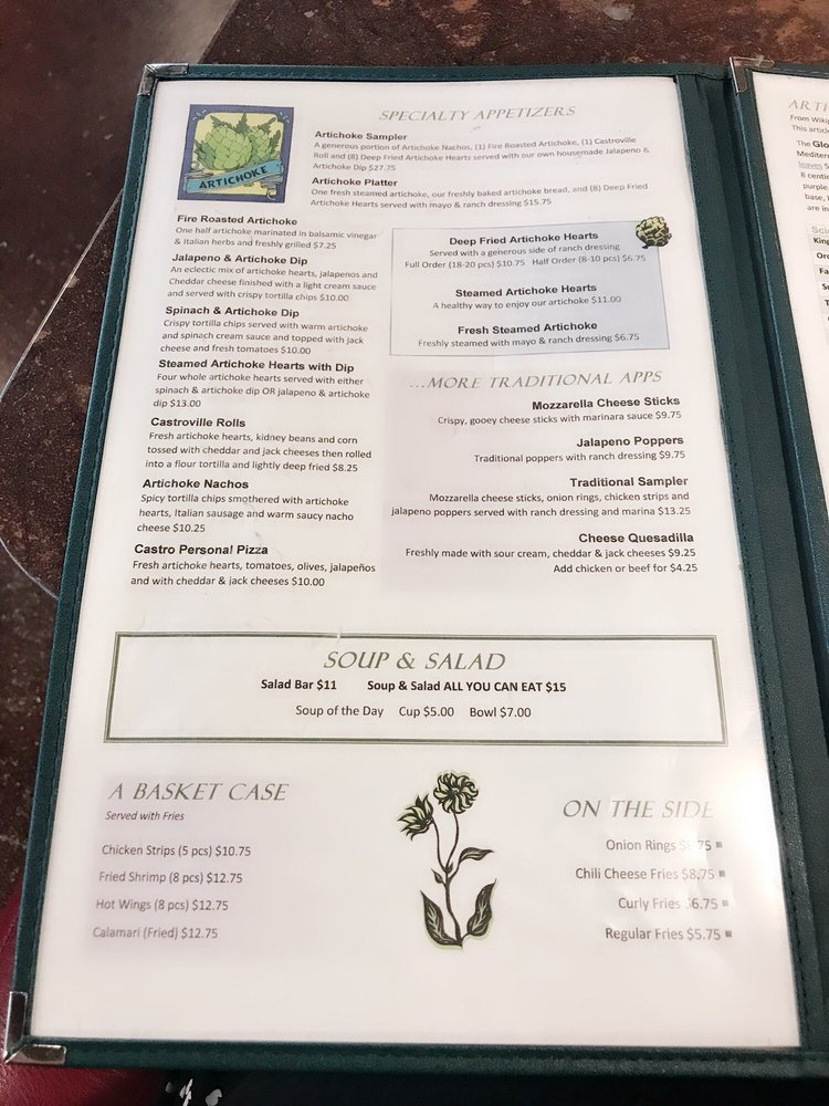 A generous portion of artichoke nachos, one fire roasted artichoke, Castroville roll, eight deep-fried artichoke hearts served with our own housemade jalapeno and artichoke dip.