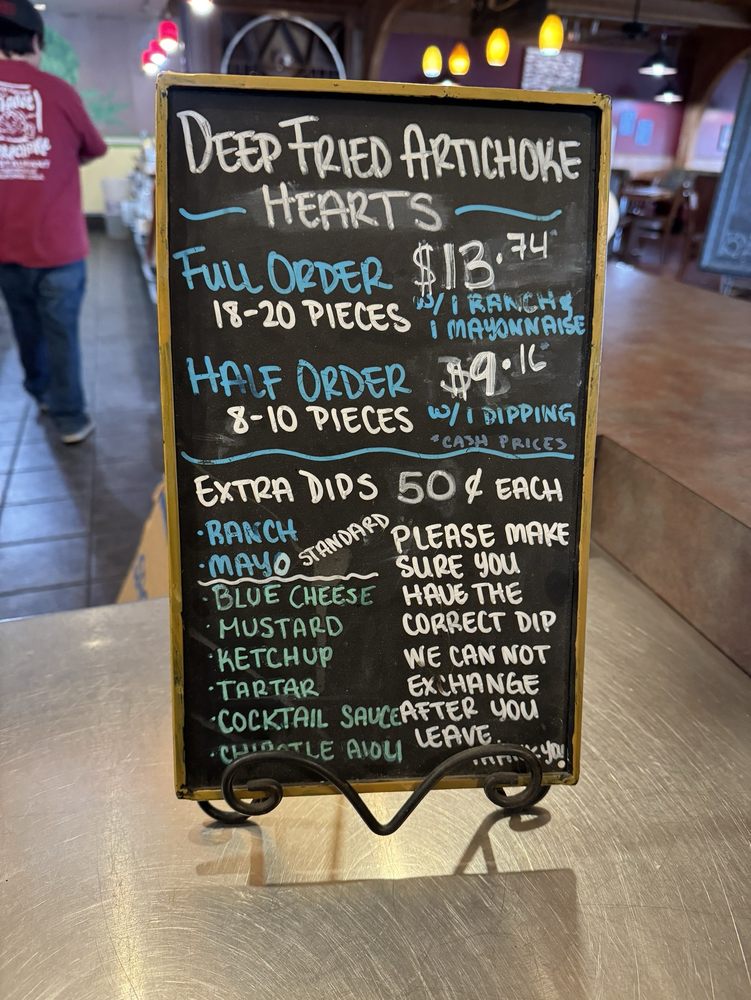One fresh steamed Artichoke, our freshly baked Artichoke bread, and eight deep-fried artichoke hearts served with mayo and ranch Dressing.
