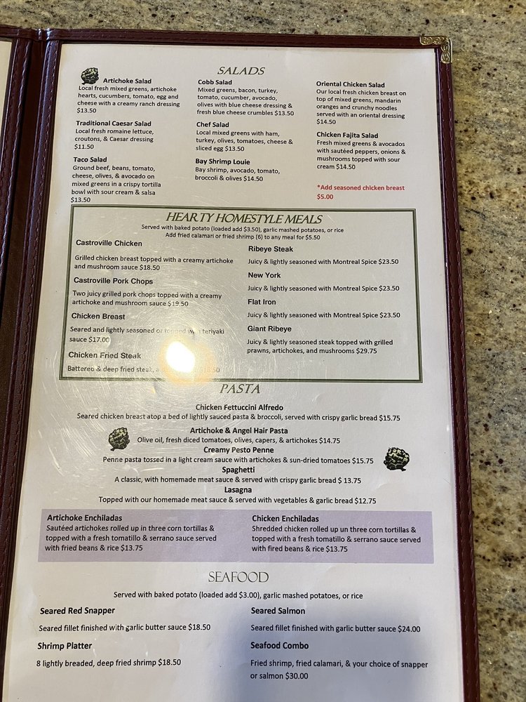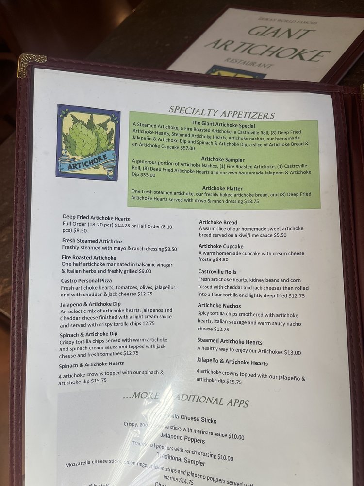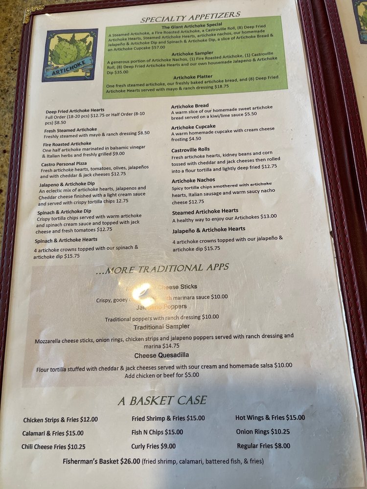 Located in Castroville, CA, the Giant Artichoke Restaurant offers a wide range of American cuisine with a focus on artichokes. This veteran-owned establishment provides a cozy and welcoming atmosphere with various amenities, including outdoor seating, wheelchair accessibility, and delivery options. Customers rave about the deep-fried artichokes, giant burger, and pasta dishes, praising the delicious flavors and excellent service. The artichoke soup is a standout, according to one patron, while another customer fondly recalls childhood visits for the fried artichoke hearts. Despite the slightly run-down appearance, visitors appreciate the affordable prices and tasty meals, making it a great spot for lunch or breakfast. Experience the heartwarming nostalgia and flavorful dishes at Giant Artichoke Restaurant today.